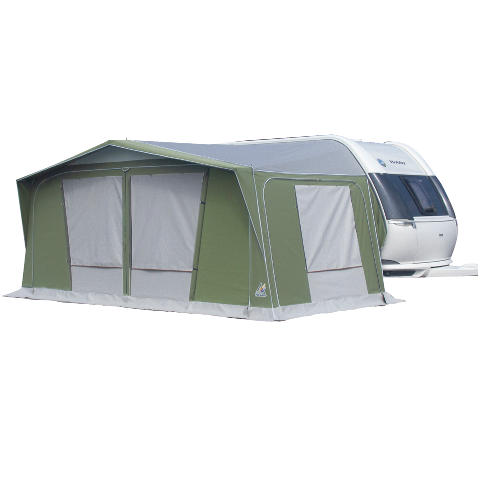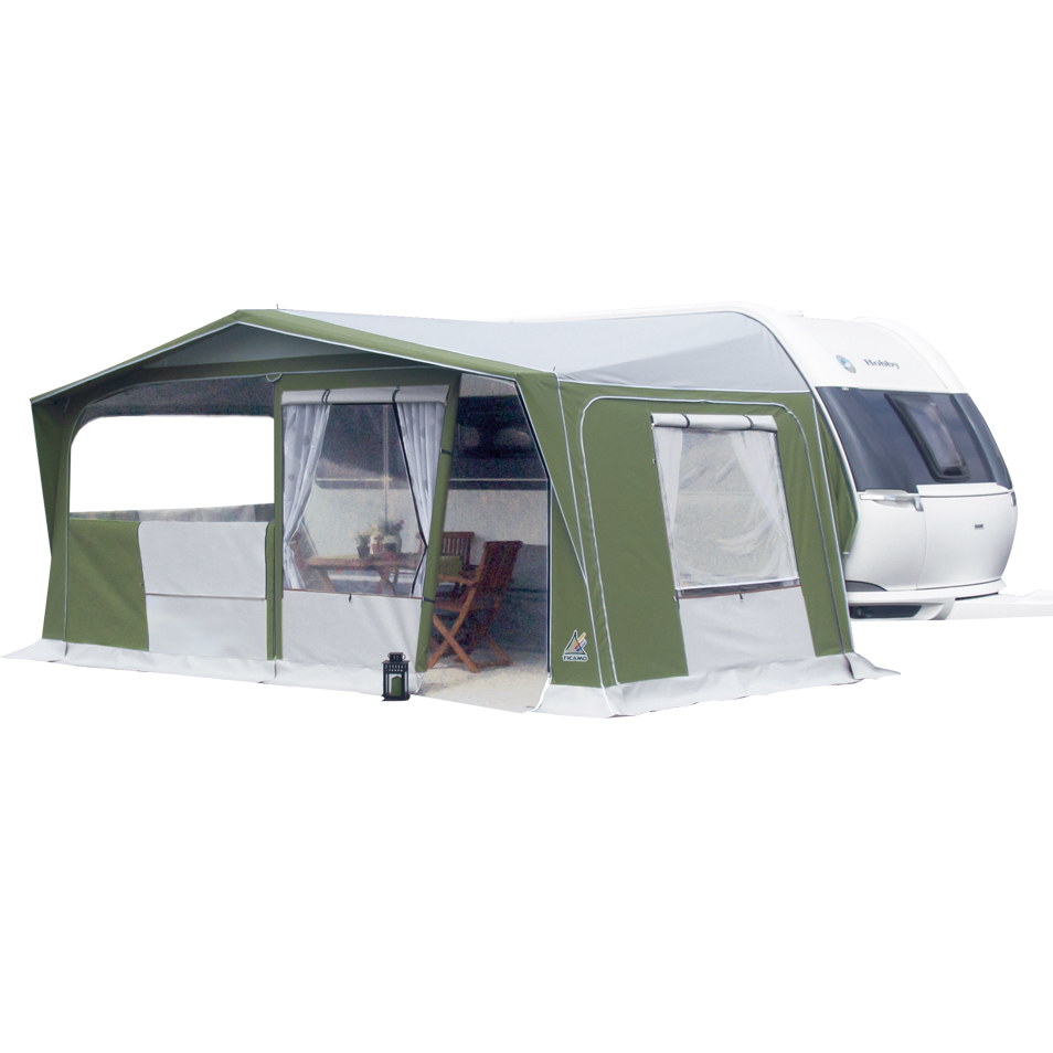 L’avanç Natura s’adapta a caravanes de 3 a 6,06 m. Està fabricat en PVC Trevira amb tons més ecològics combinant verd i gris clar. De fàcil rentat i neteja.