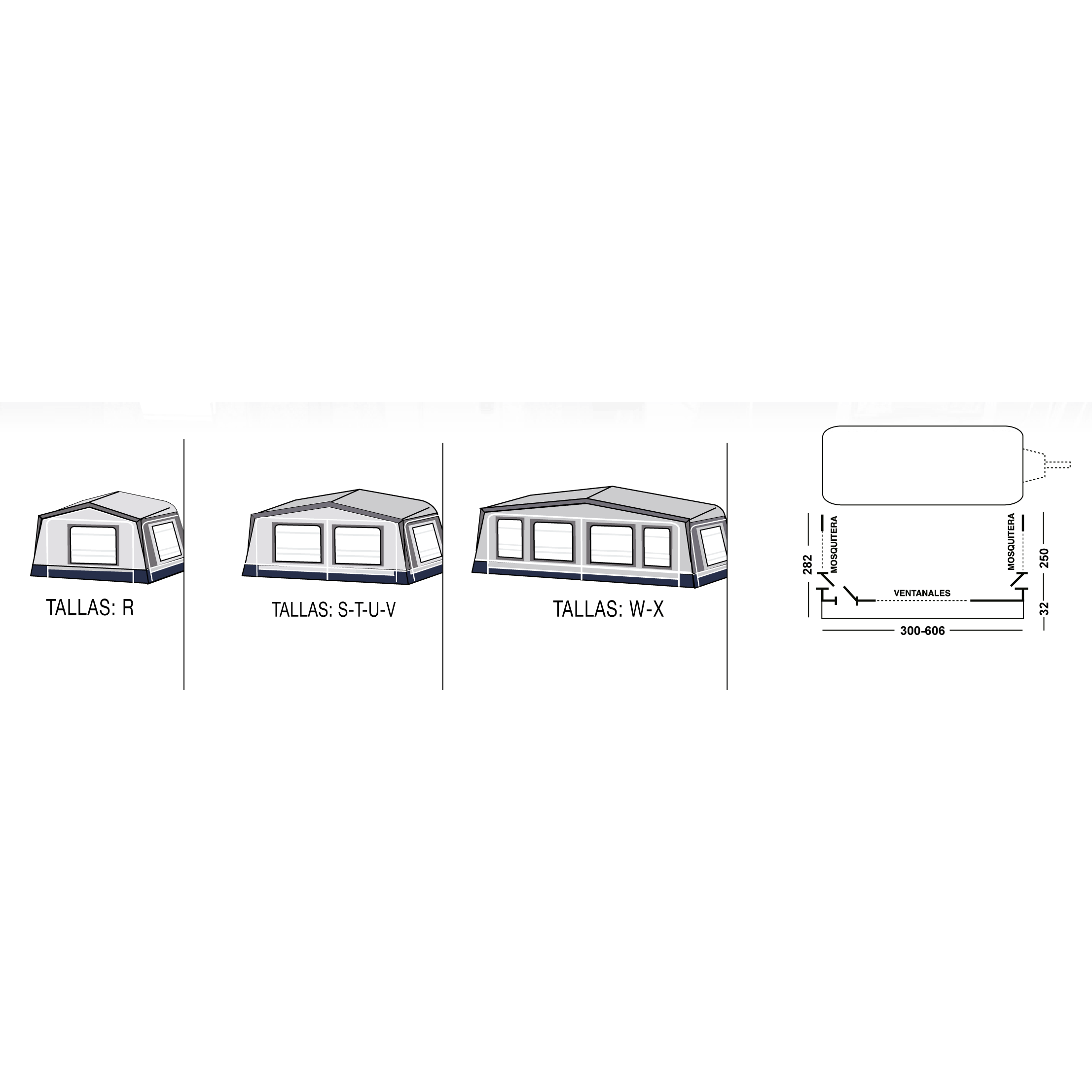 Doble Avancé. Habitació interior. Balconera frontal i lateral. Armadura de fibra de vidre. Sostre PVA Ten Cate All Season. Suports FIX-ON. Velum (Doble Sostre). Doble Faldón. Set de cinchas universal. Possibilitat d’acoblar annex lateral.